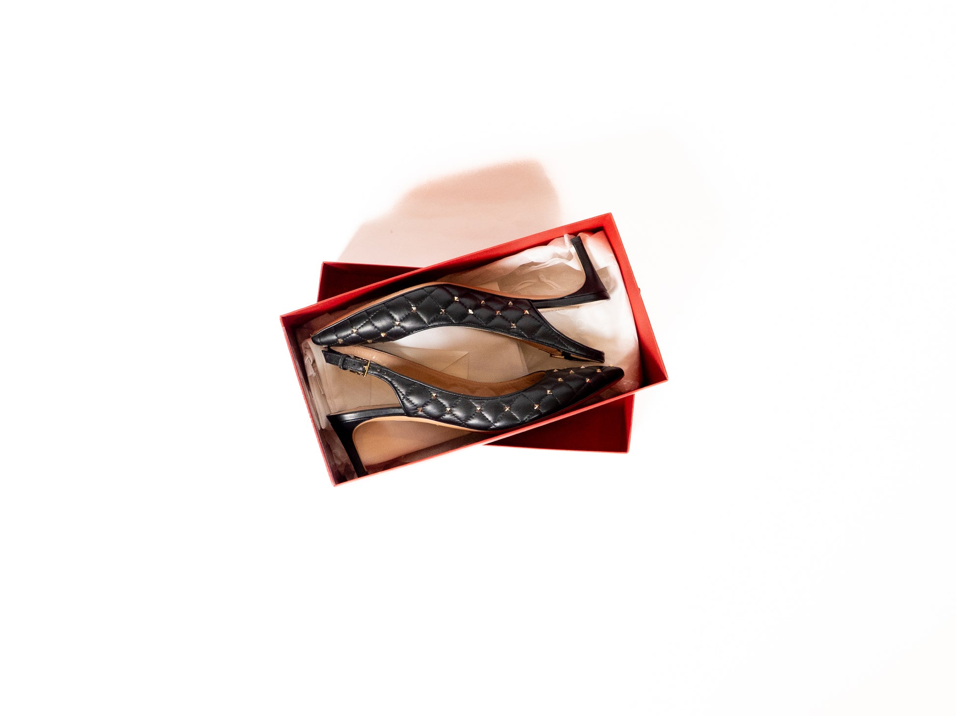 Chaussures petits talons en cuir nappa matelassé noir ornée de clous pyramidaux finition platine.